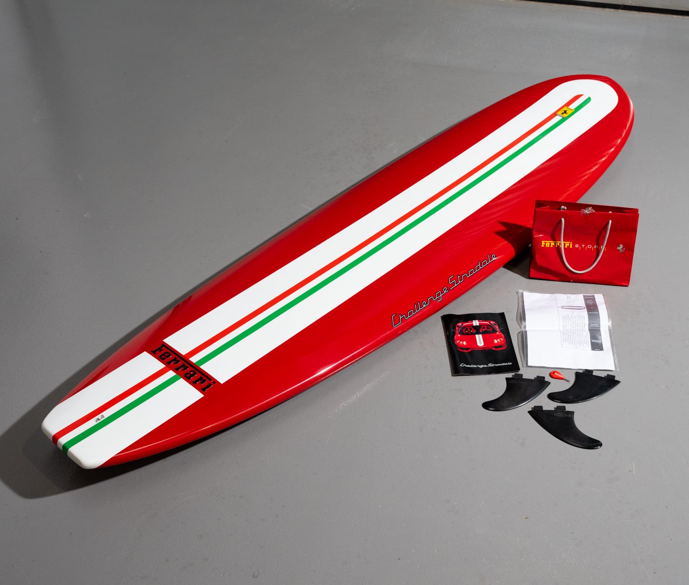 Limited Edition Ferrari 360 CS Surfboard. This surfboard was limited to just 425 pieces, with reference to the 425 horsepower the car has. Constructed from polyurethane with glass fibre and resin. Features include the classic ‘Ferrari’ scripting along with the notorious Challenge Stradale stripe. The surfboard comes with 3x fins, a CS book which includes a certificate of authenticity and a production note, all of which are housed in the official Ferrari Store bag. The board measures 7 feet in length. New Old Stock, presented in unused, wonderful condition.