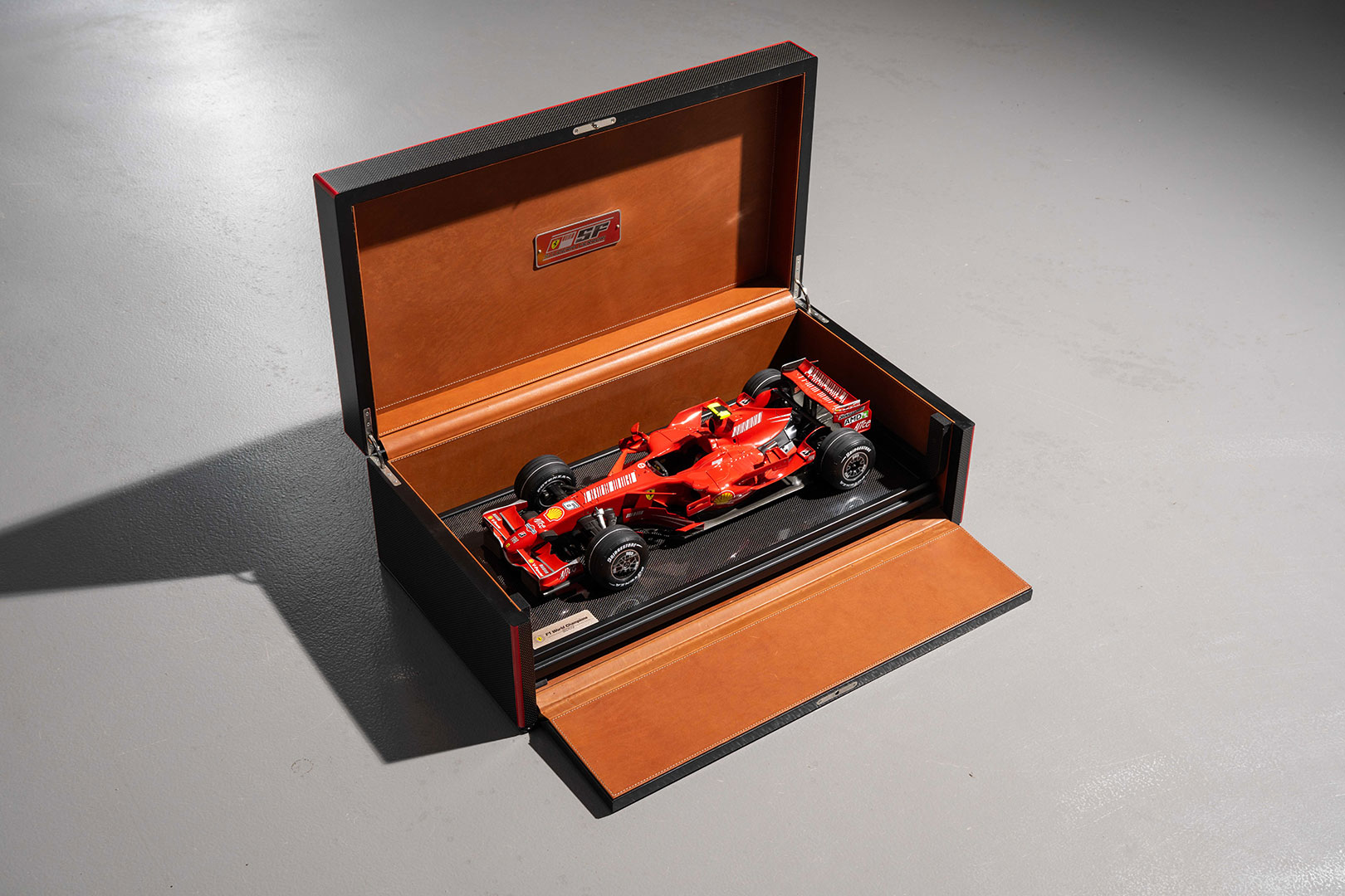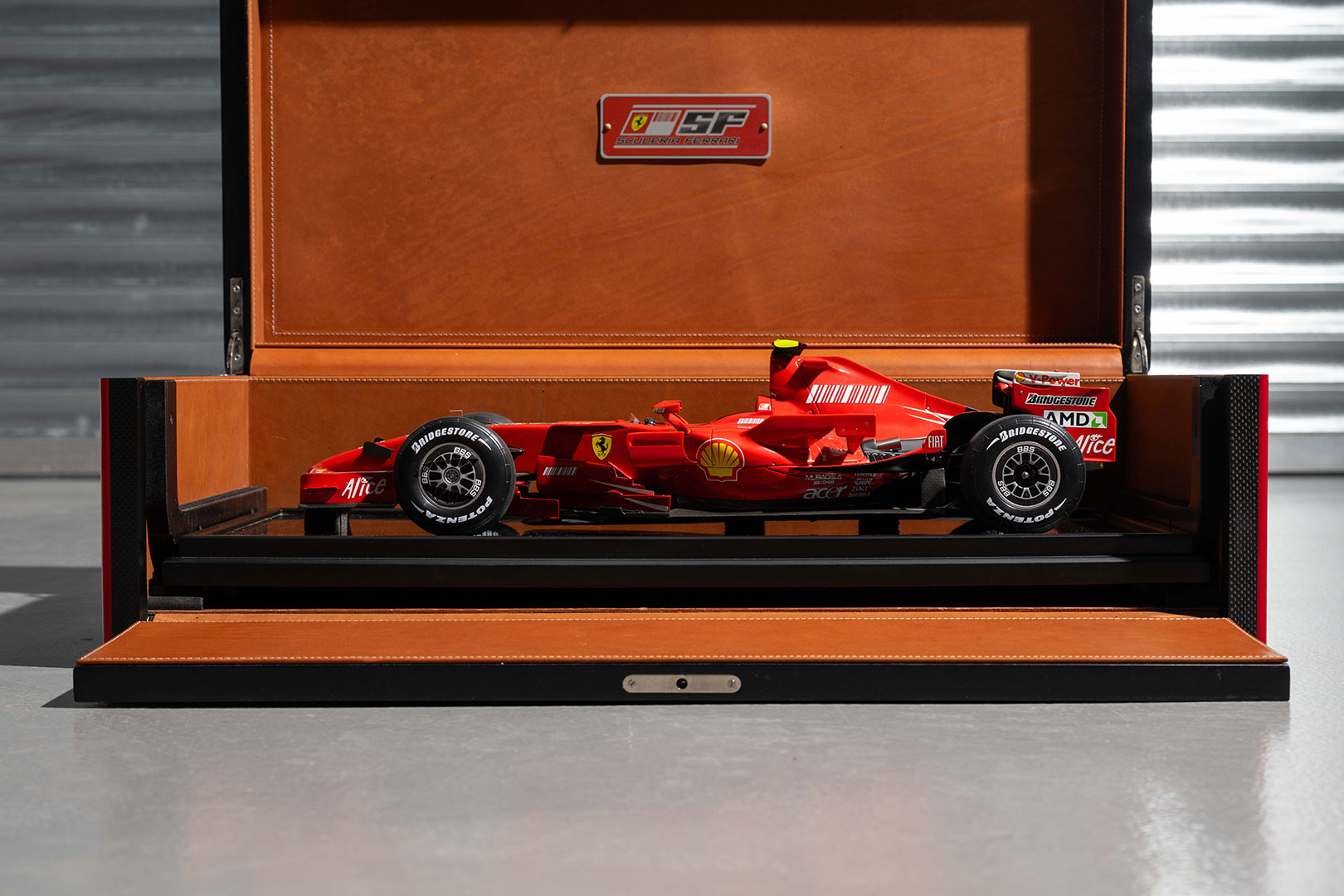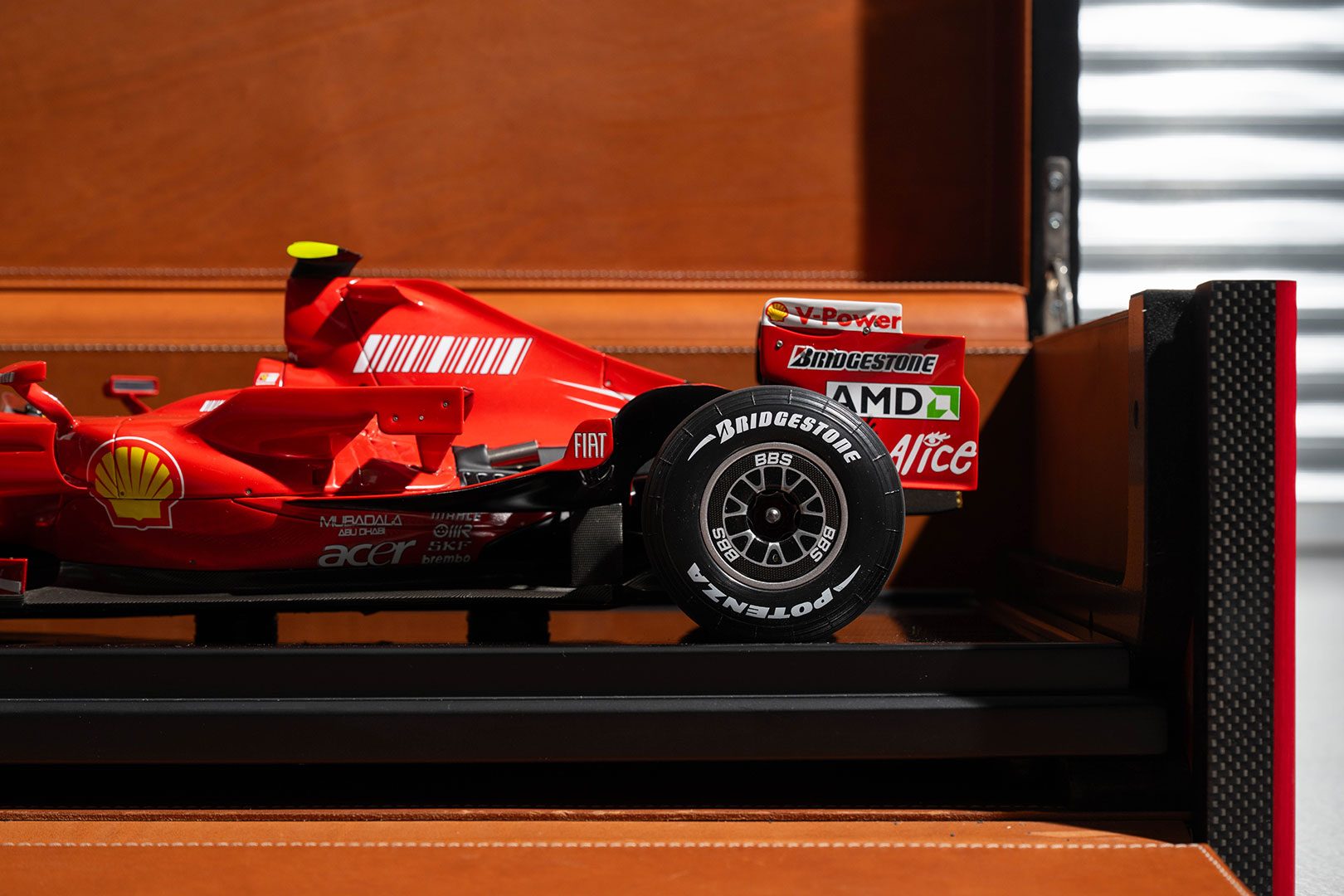 1:8 Scale Ferrari F2007 (2007) British Grand Prix Amalgam Model. The car that powered Kimi Räikkönen and Scuderia Ferrari to double 2007 FIA Formula One World Championship glory, the F2007 was a contender in one of the most exciting seasons in Formula 1 history. Presented in a stylish carbon fibre box with tan leather interior and white stitching.
