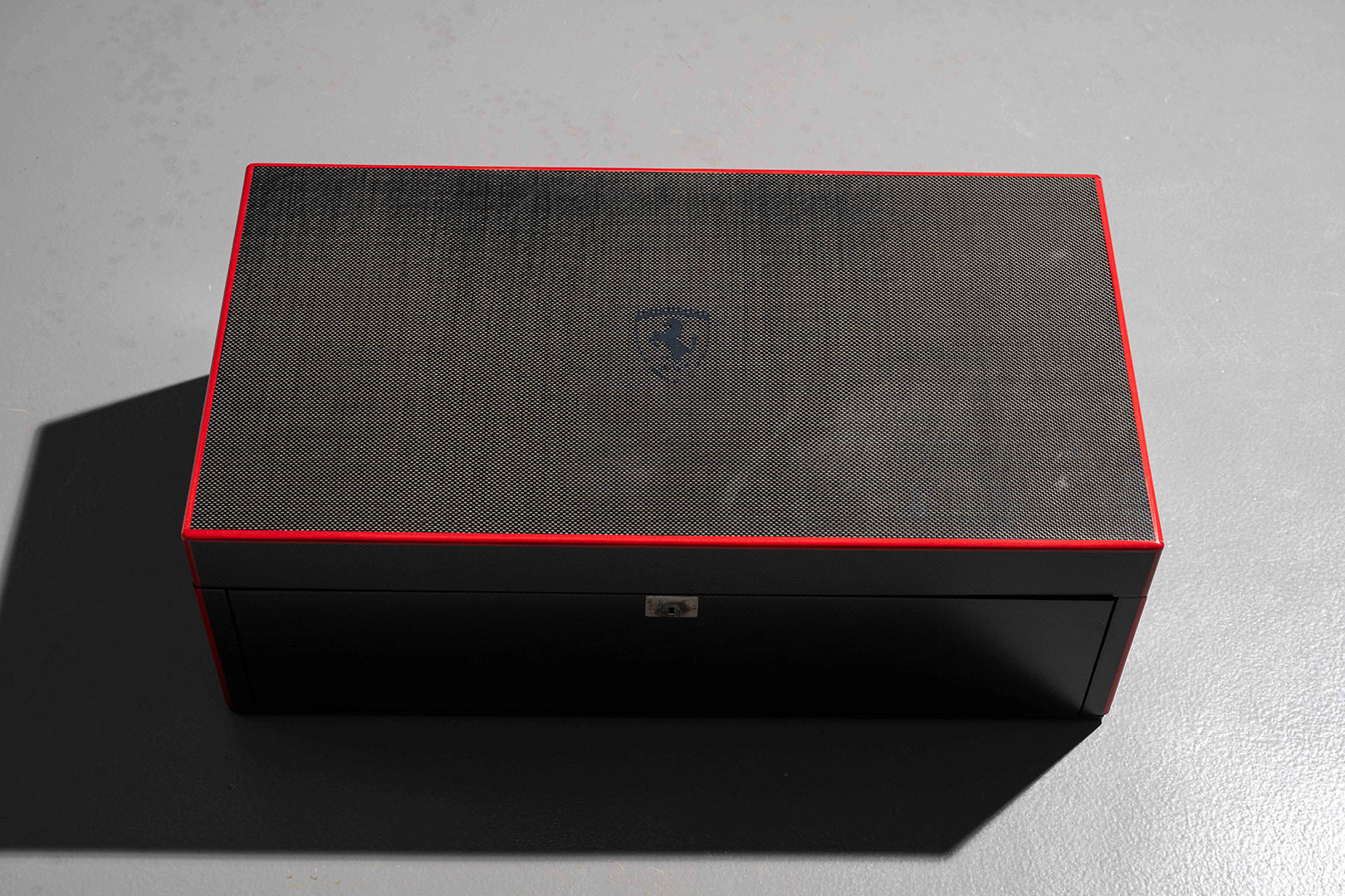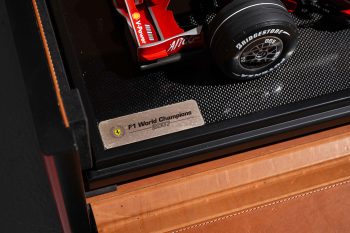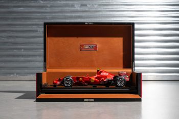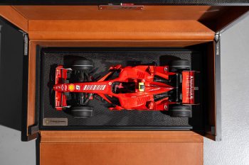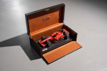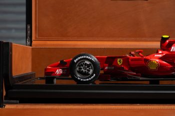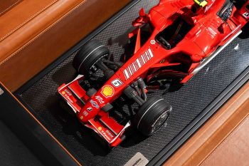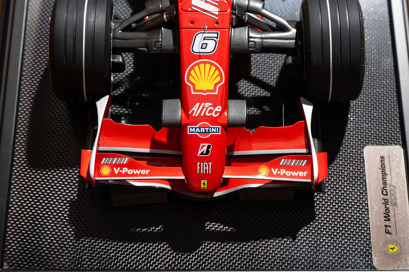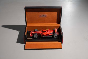 1:8 Scale Ferrari F2007 (2007) British Grand Prix Amalgam Model. The car that powered Kimi Räikkönen and Scuderia Ferrari to double 2007 FIA Formula One World Championship glory, the F2007 was a contender in one of the most exciting seasons in Formula 1 history. Presented in a stylish carbon fibre box with tan leather interior and white stitching.