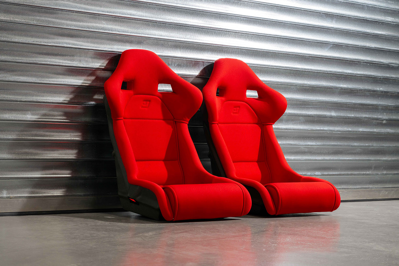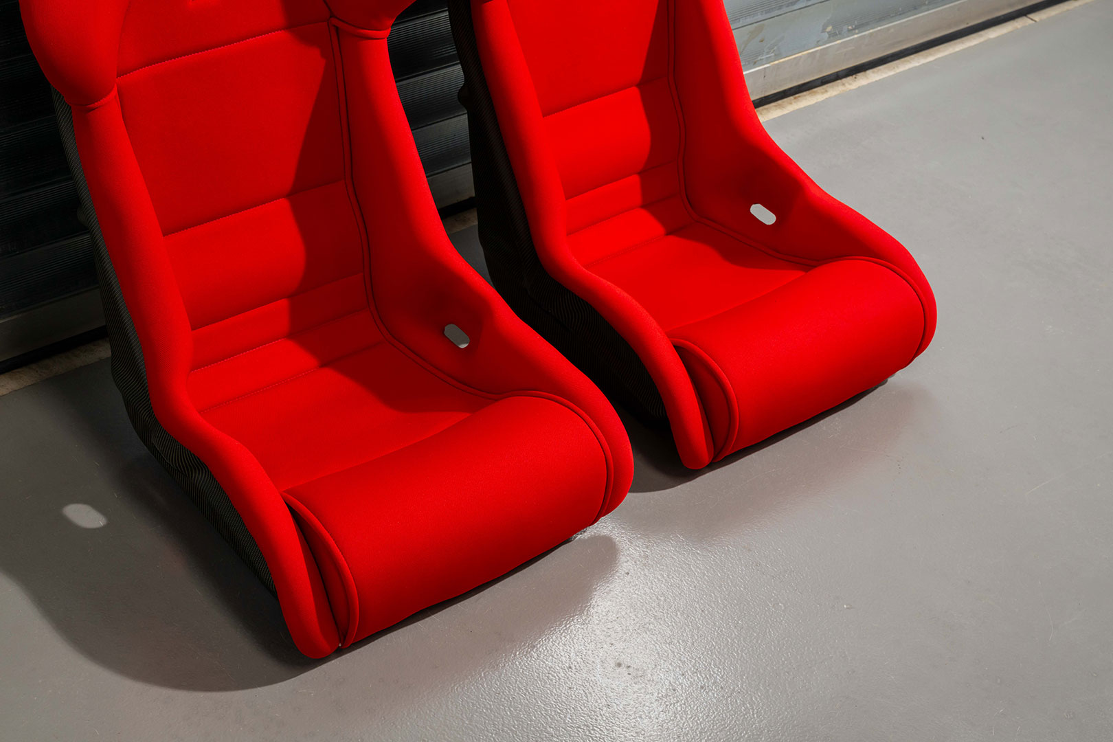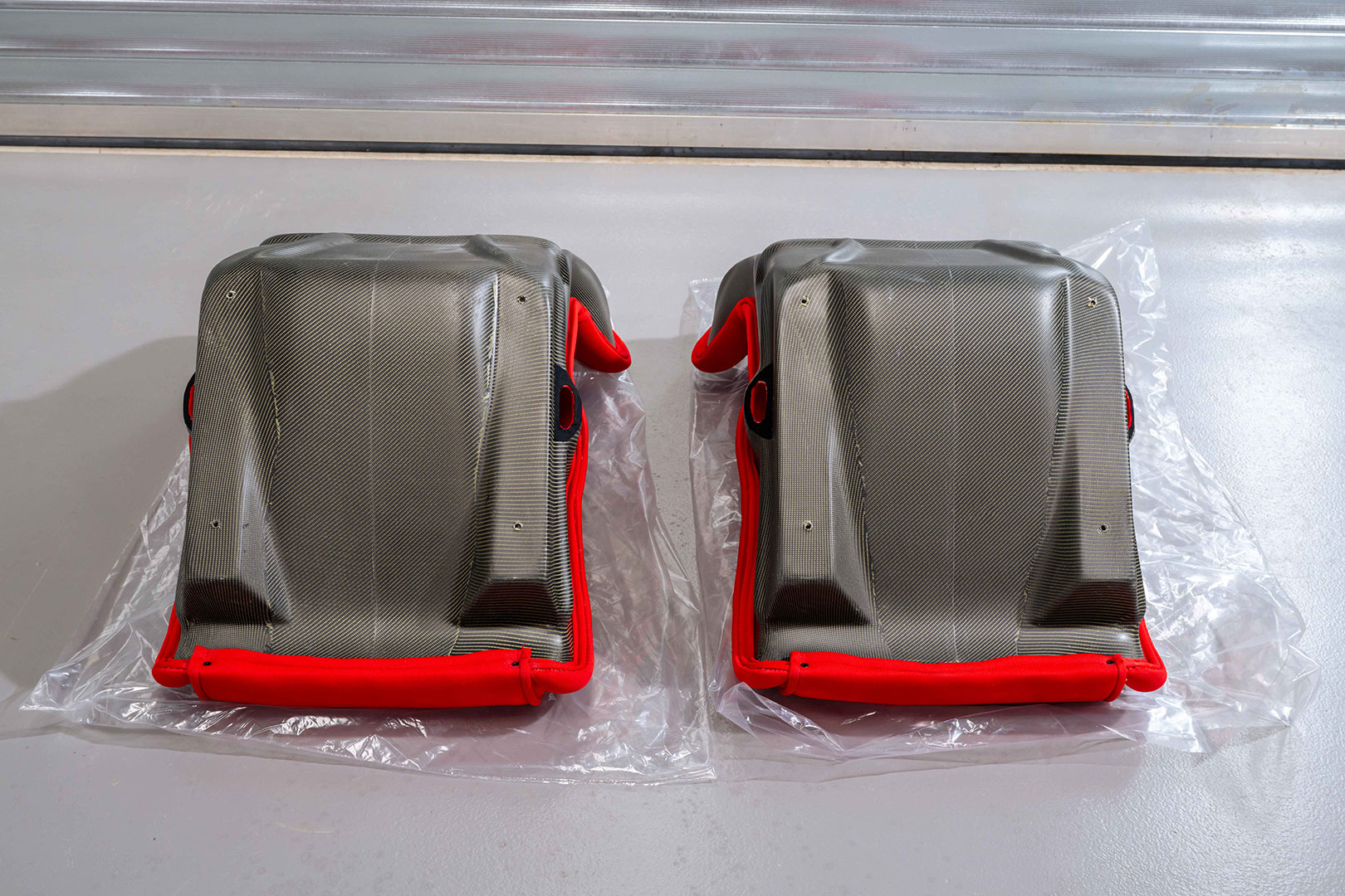 Ferrari F40 Euro Spec Seats. Manufactured from moulded carbon-kevlar composite and recently professionally reupholstered using the correct red Nomex fabric.