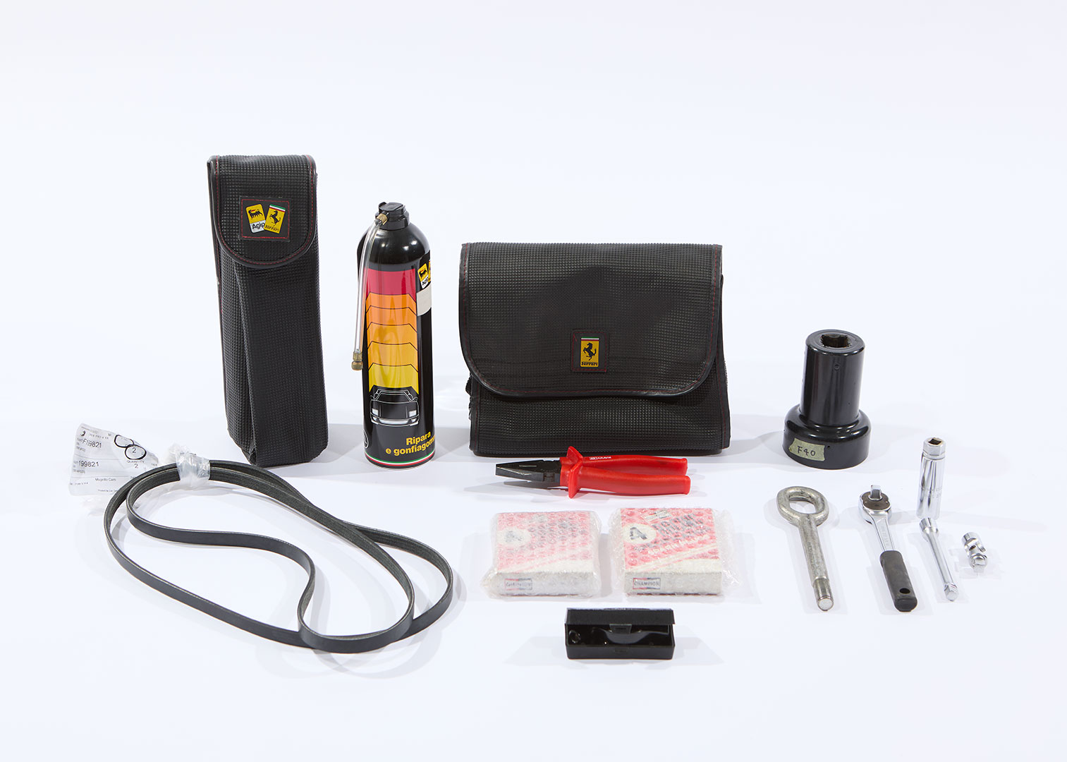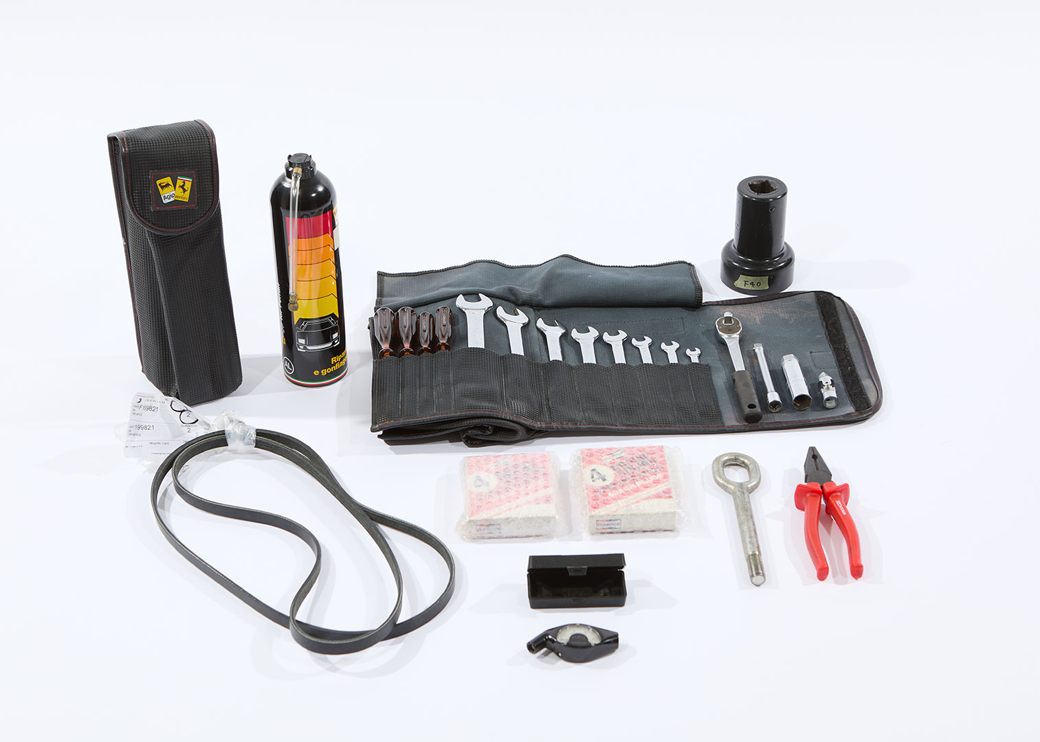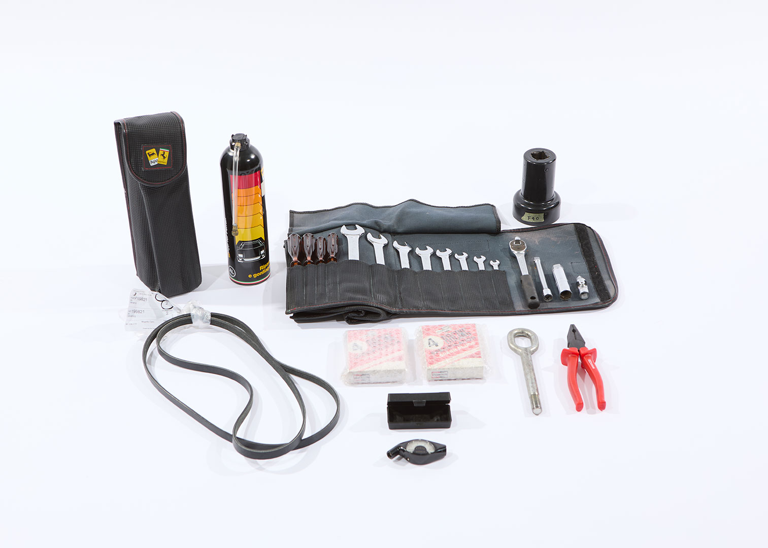 Comes complete with tool bag, 4 x screwdrivers, 8 x spanners, complete set of wrenches, pliers, wheel nut wrench, tow hook eye, light bulb and fuse container, Champion spark plug set, travel belts, Michelin Vigil Tyre Pressure Manometer, Agip tyre inflator & Bag.