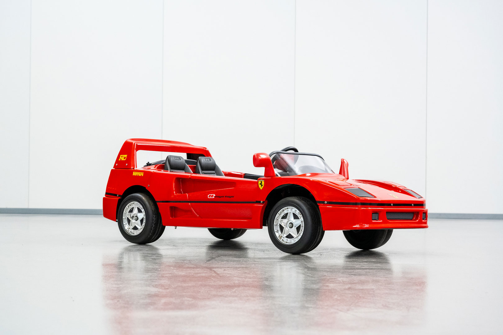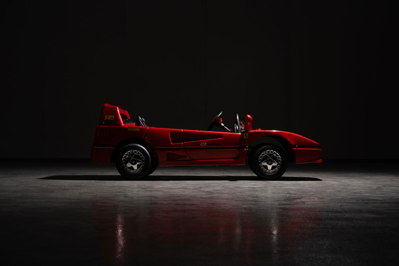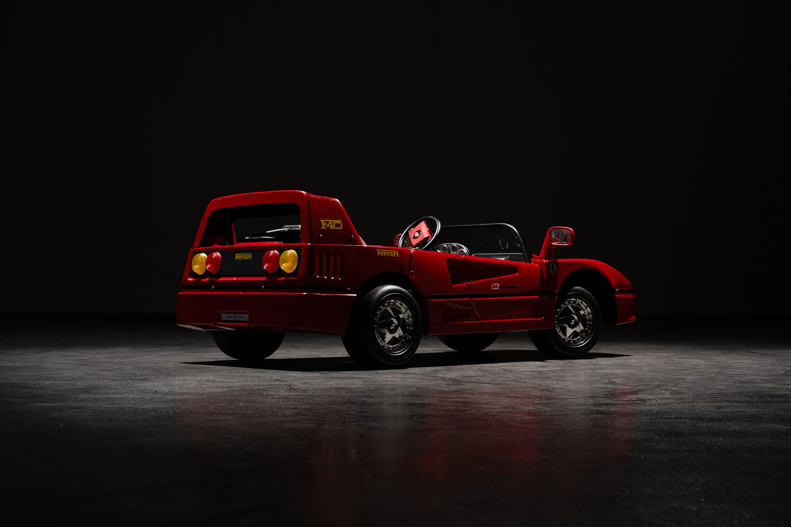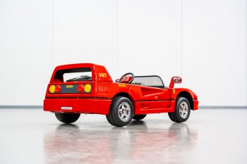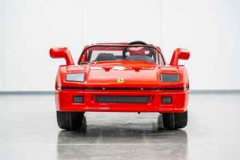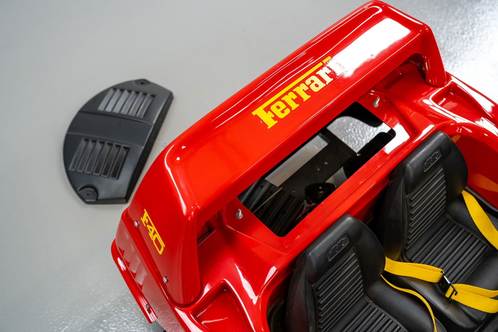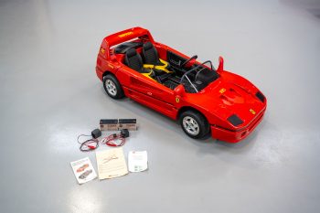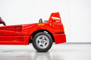 This electric go-kart was produced by TT Toys Toys of Tribiano, Italy, to resemble a Ferrari F40. It features red moulded plastic bodywork over a steel chassis, and power is sent to the rear axle via an electric motor with forward and reverse settings. Features include a windscreen, a rear wing, and plastic seats with yellow lap belts. This F40-style go-kart comes with the two original batteries and chargers, manufacturer’s literature, original spare fuses, and a bill of sale. Measuring 66″ long and 27″ wide, this F40 Child’s car is presented in like new condition.