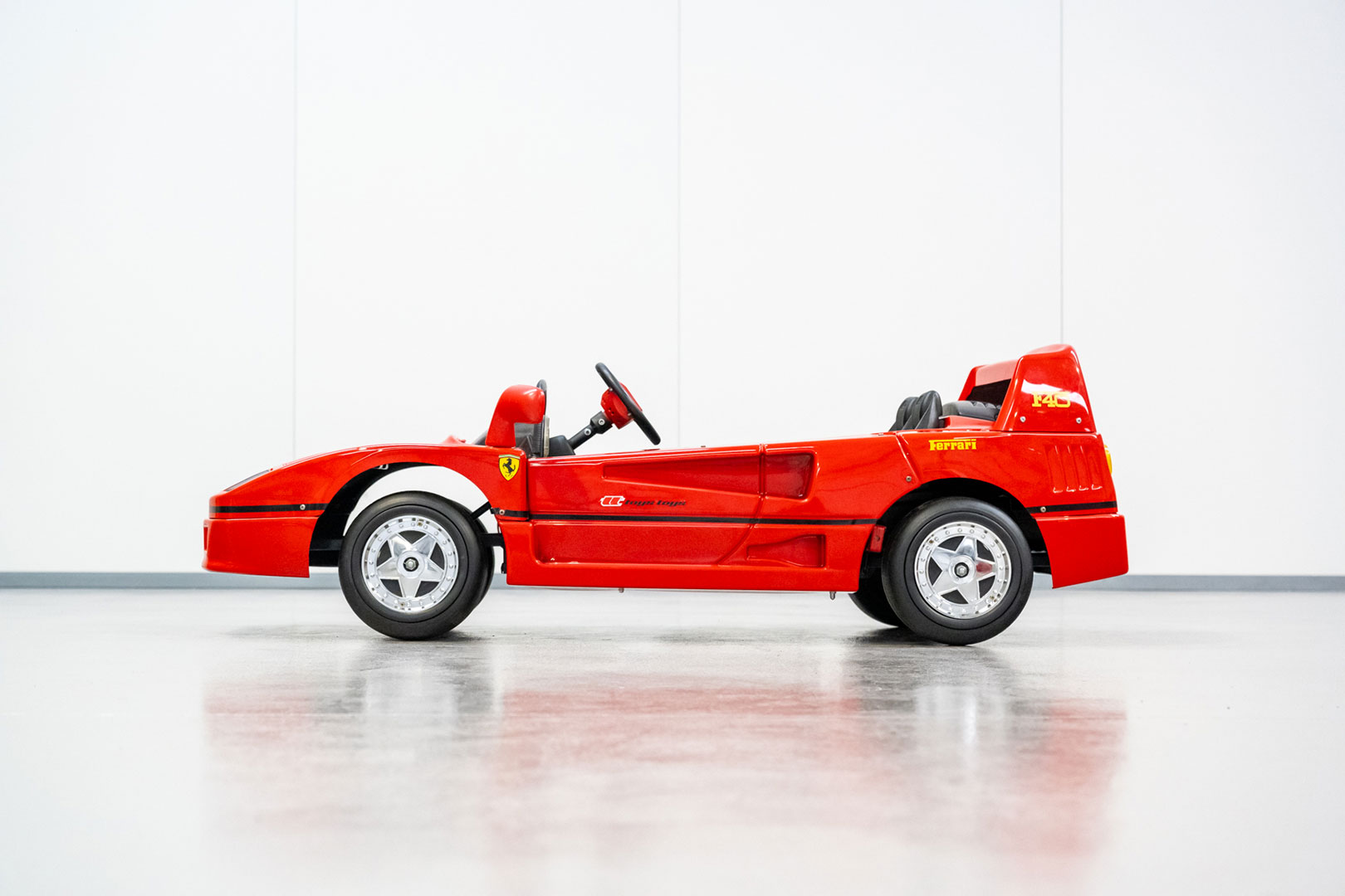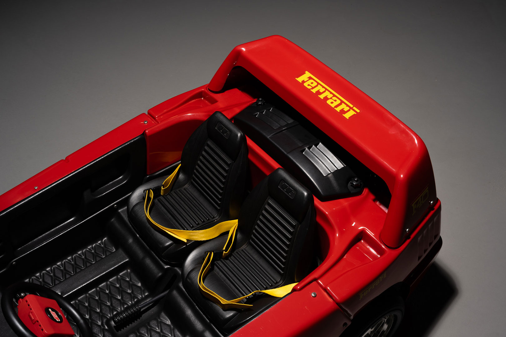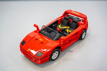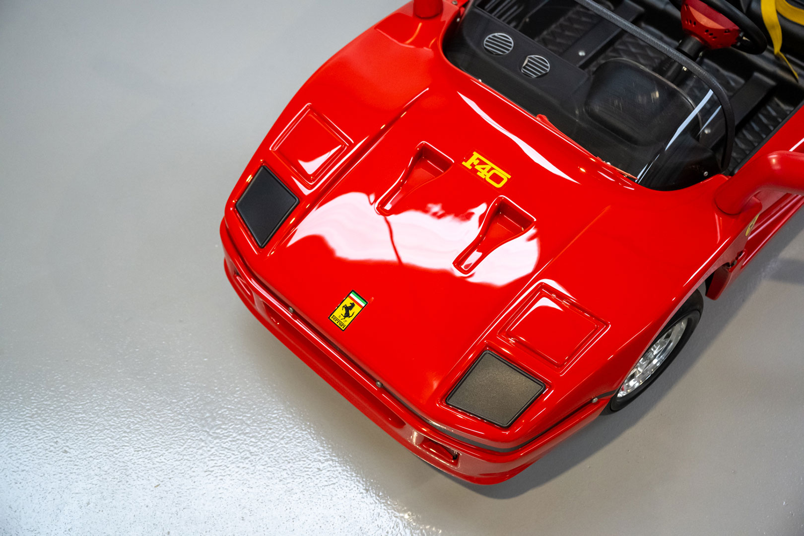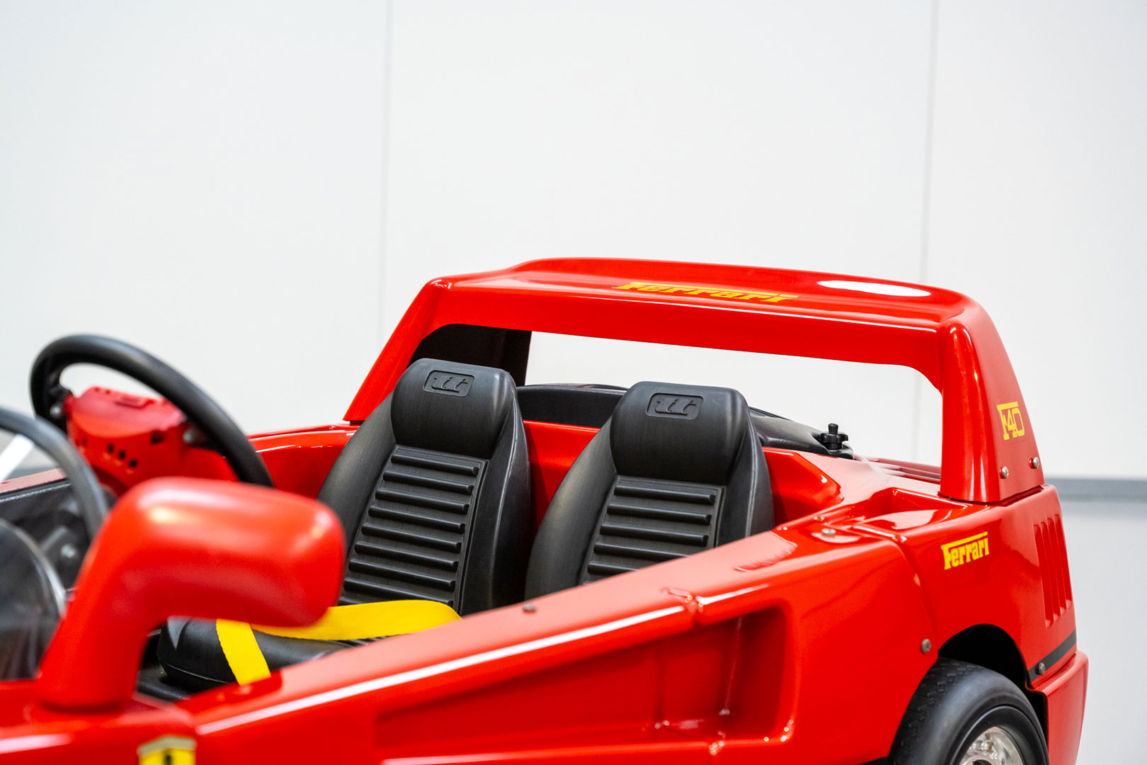 This electric go-kart was produced by TT Toys Toys of Tribiano, Italy, to resemble a Ferrari F40. It features red moulded plastic bodywork over a steel chassis, and power is sent to the rear axle via an electric motor with forward and reverse settings. Features include a windscreen, a rear wing, and plastic seats with yellow lap belts. This F40-style go-kart comes with the two original batteries and chargers, manufacturer’s literature, original spare fuses, and a bill of sale. Measuring 66″ long and 27″ wide, this F40 Child’s car is presented in like new condition.