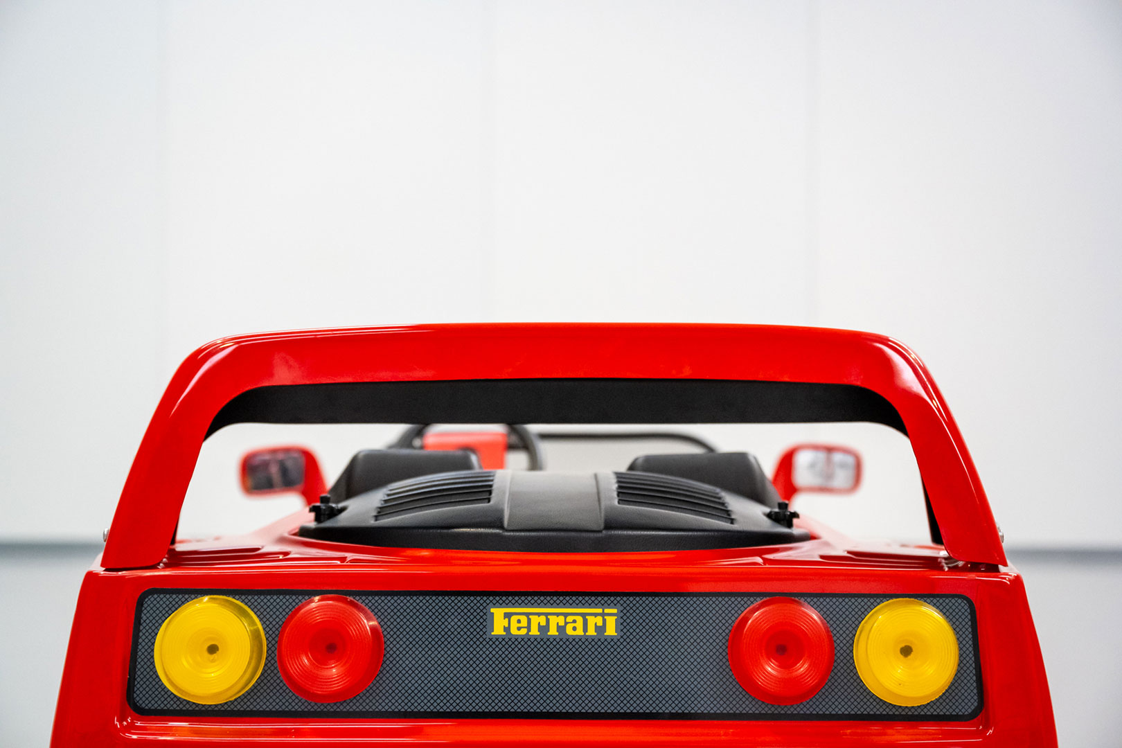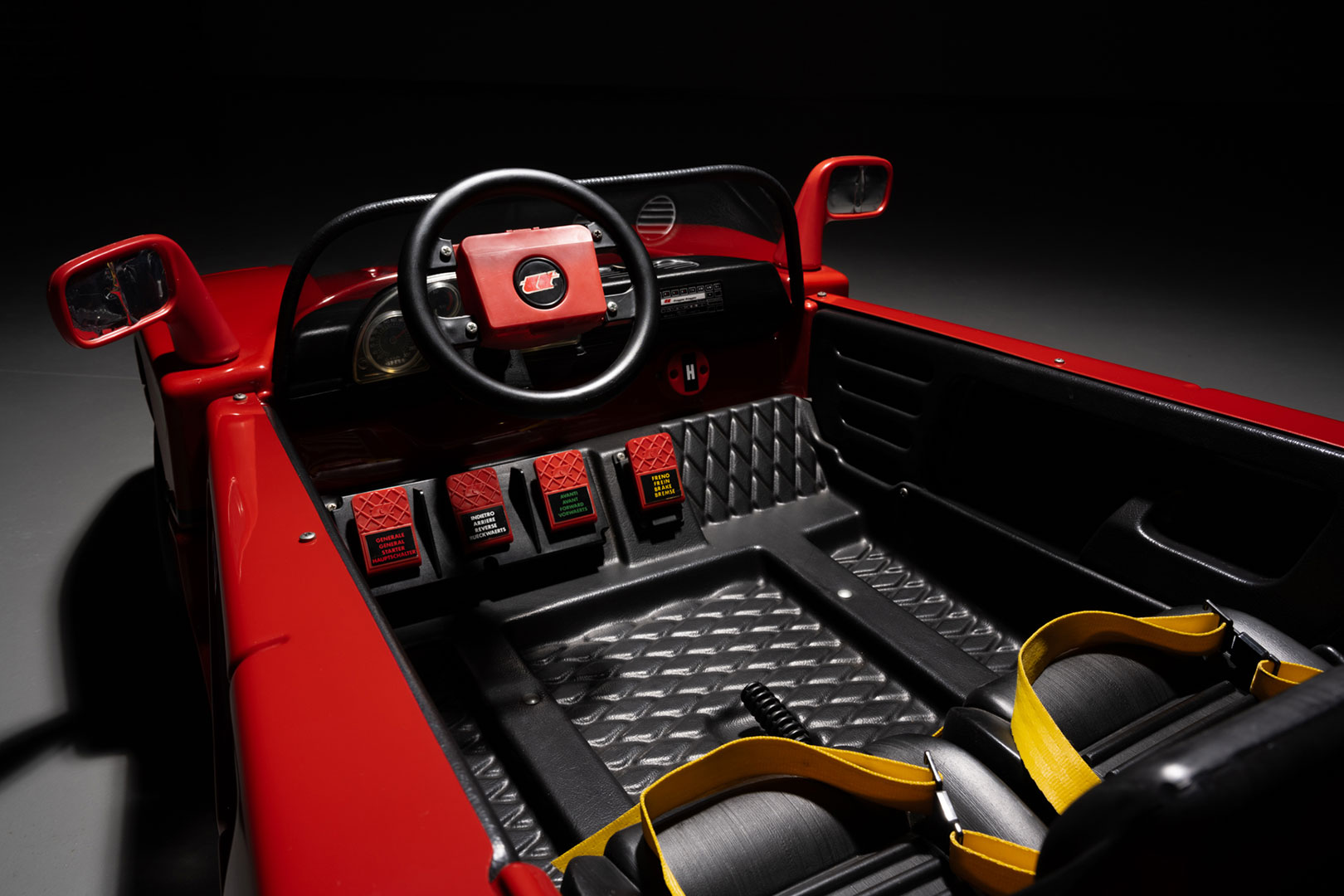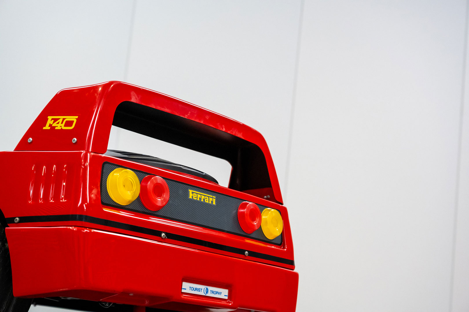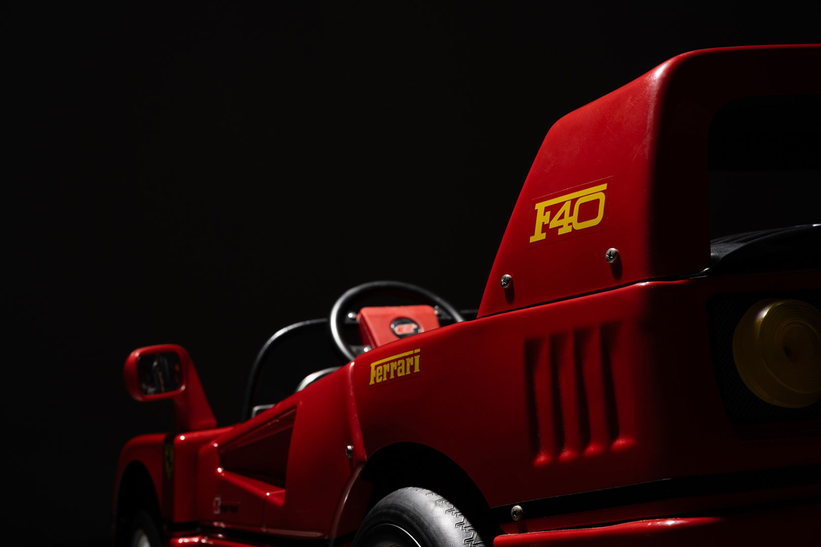 This electric go-kart was produced by TT Toys Toys of Tribiano, Italy, to resemble a Ferrari F40. It features red moulded plastic bodywork over a steel chassis, and power is sent to the rear axle via an electric motor with forward and reverse settings. Features include a windscreen, a rear wing, and plastic seats with yellow lap belts. This F40-style go-kart comes with the two original batteries and chargers, manufacturer’s literature, original spare fuses, and a bill of sale. Measuring 66″ long and 27″ wide, this F40 Child’s car is presented in like new condition.