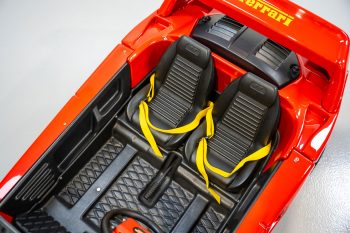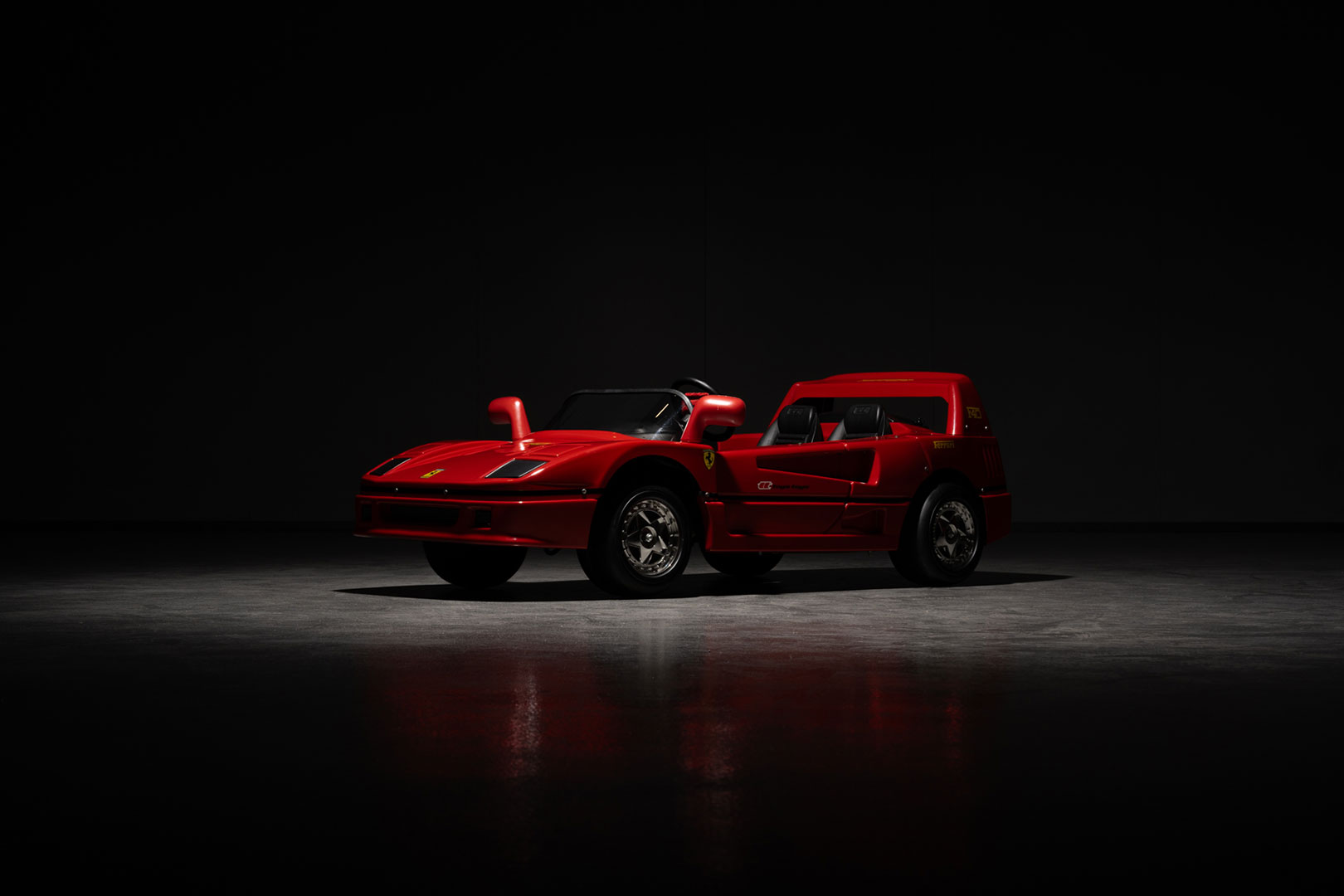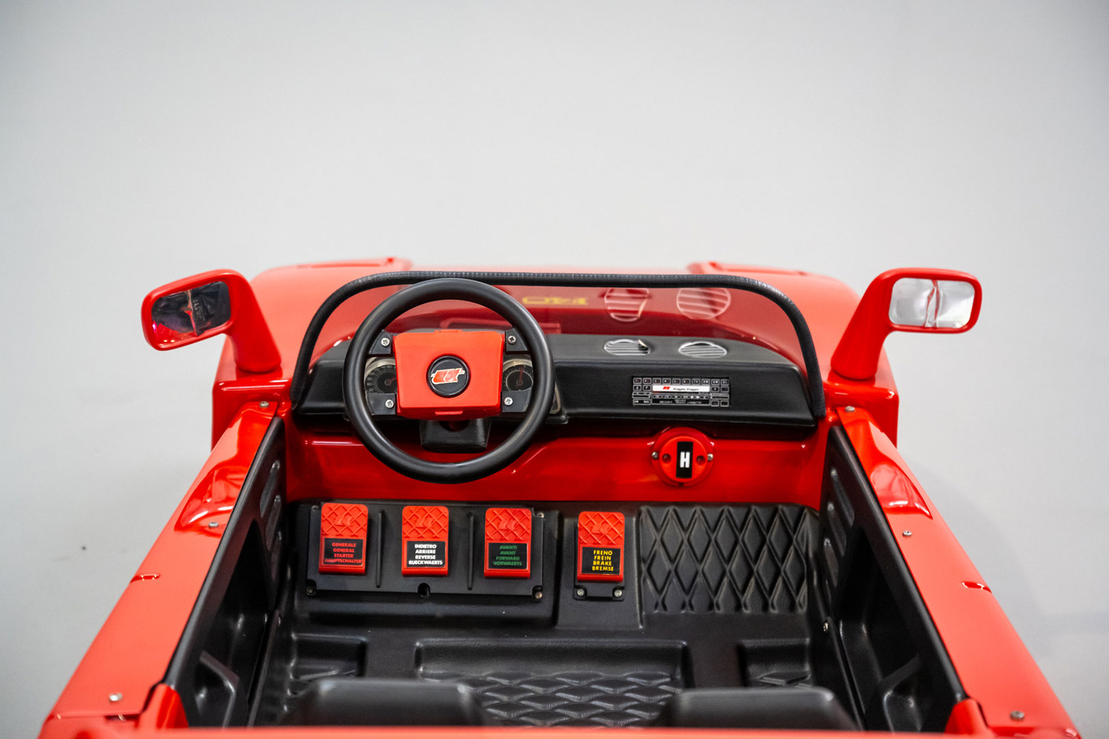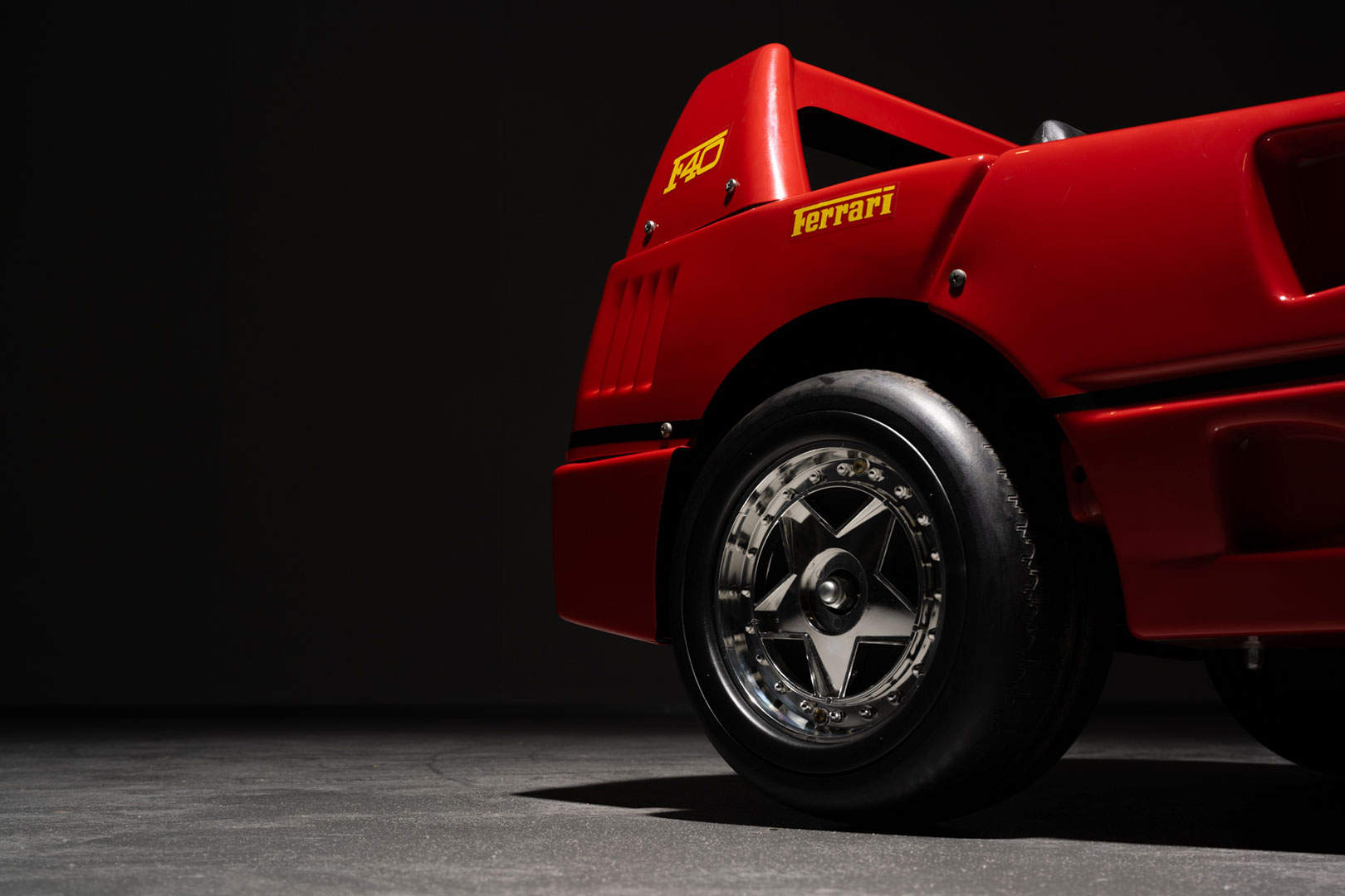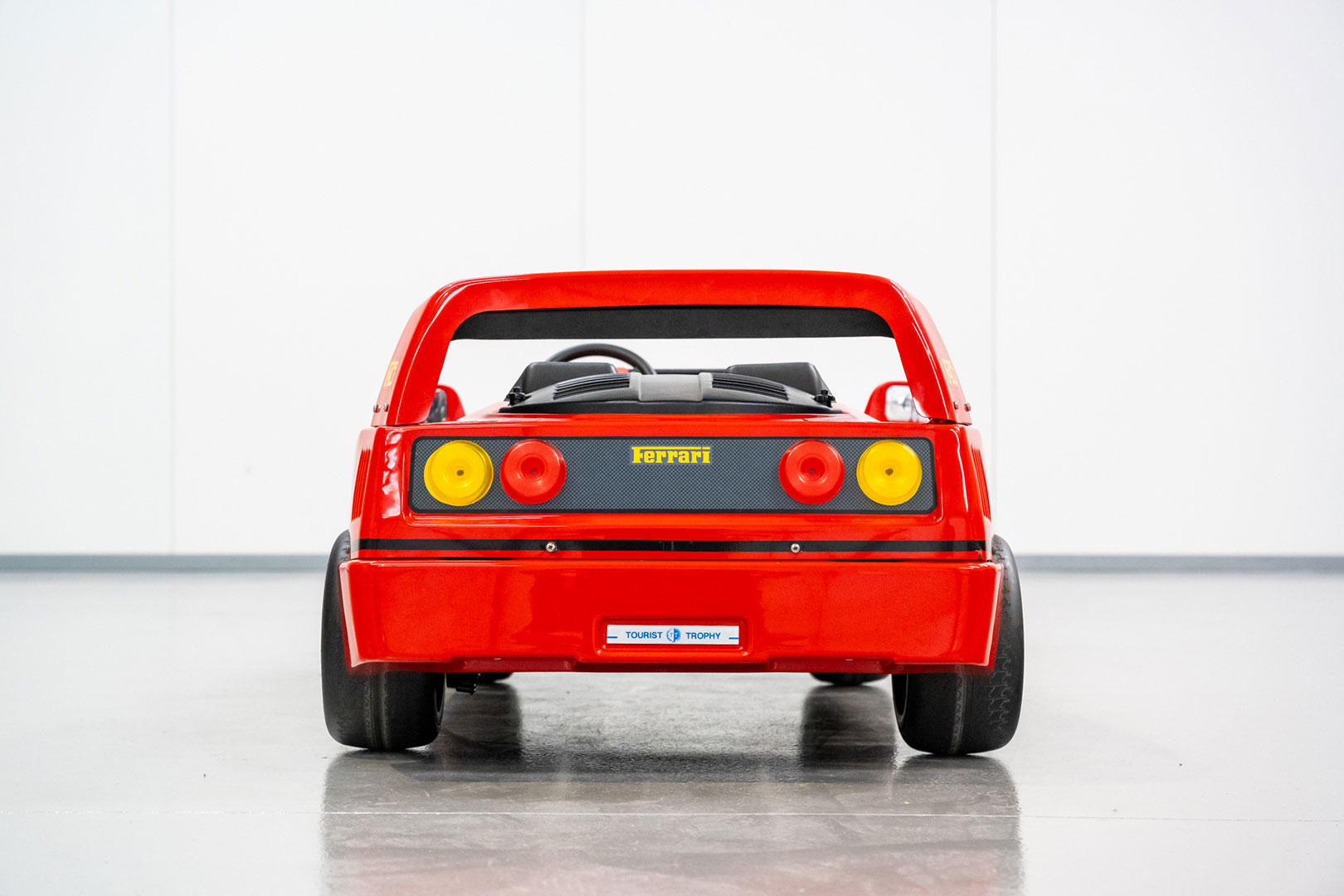 This electric go-kart was produced by TT Toys Toys of Tribiano, Italy, to resemble a Ferrari F40. It features red moulded plastic bodywork over a steel chassis, and power is sent to the rear axle via an electric motor with forward and reverse settings. Features include a windscreen, a rear wing, and plastic seats with yellow lap belts. This F40-style go-kart comes with the two original batteries and chargers, manufacturer’s literature, original spare fuses, and a bill of sale. Measuring 66″ long and 27″ wide, this F40 Child’s car is presented in like new condition.